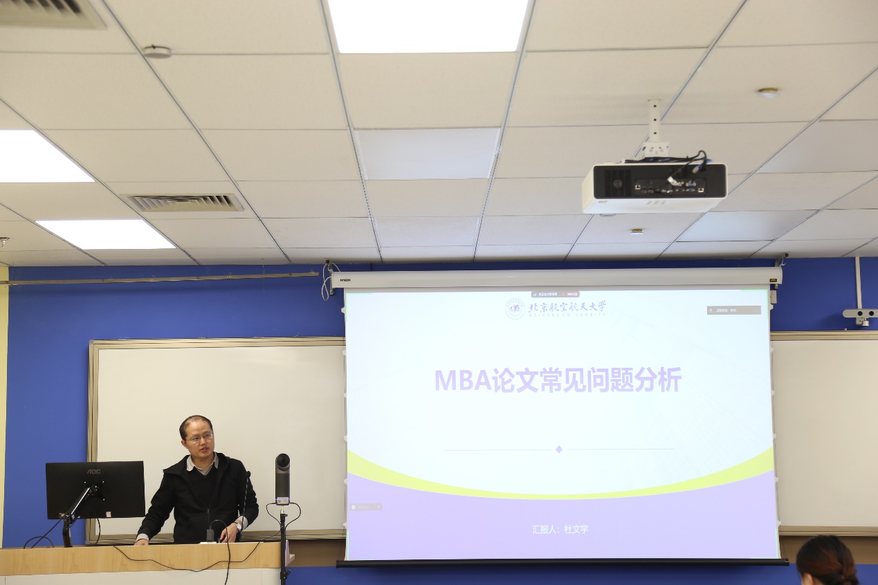 第二个环节是“近年MBA论文常见问题分析”。杜文宇副教授结合近两年经管学院MBA案例研究类论文的实际情况,分析论文中常见的问题和不足之处。他从选题的创新性、研究的深度、数据的可靠性、结论的合理性等多个方面入手,深入剖析问题的根源和解决方法。